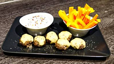 Hol die fertigen Hackbällchen aus dem Ofen und richte sie zusammen mit dem Kräuterquark und den Gemüse-Sticks auf einem Teller an.